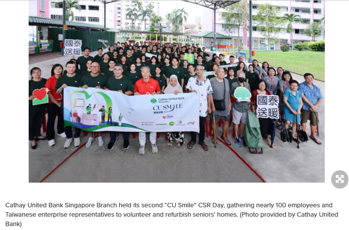 Cathay United Bank (CUB) is committed to sustainability and proactively advancing corporate social responsibility (CSR) across its overseas branches. The Singapore Branch recently held its second “CU Smile” CSR Day, bringing together nearly 100 staff members and representatives from Taiwanese enterprises to serve as volunteers. They visited seniors’ homes along Yishun Ring Road, carrying out cleaning, painting, and refurbishment to improve living conditions for the elderly. For the first time, CUB partnered with TOUCH Elderly Group[1], a Singapore non-profit organization dedicated to disadvantaged communities, demonstrating a model for working with cross-border enterprises to maximize local resources for the community.