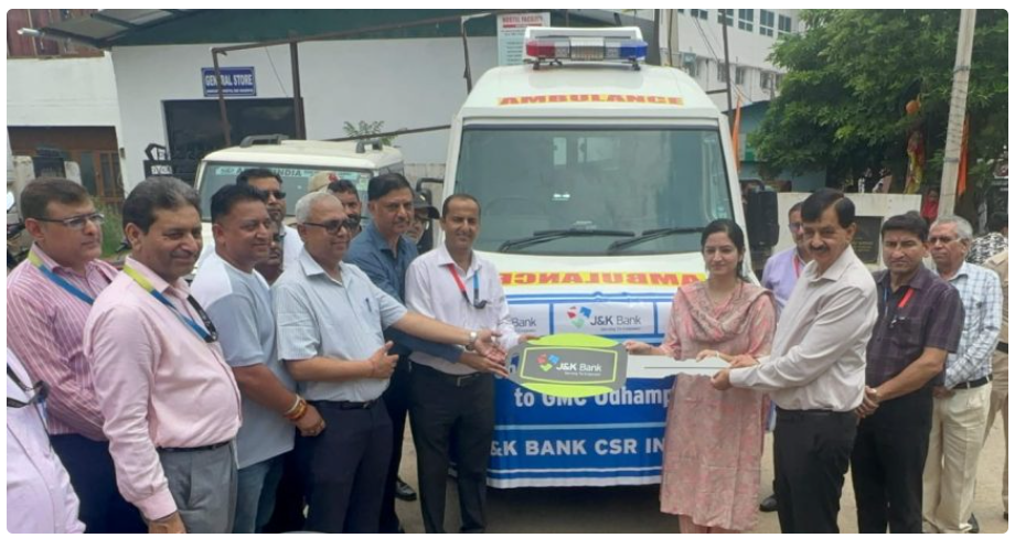 Reaffirming its commitment to people’s well-being and healthcare infrastructure in the region, J&K Bank Monday provided a life-support ambulance to Government Medical College (Udhampur) as part of its Corporate Social Responsibility (CSR) initiative aimed at strengthening emergency medical services in Jammu Division.A statement issued here said that in a brief ceremony held within the college premises, Bank’s Zonal Head (Udhampur) Vinay Gupta handed over the key of the fully-equipped ambulance to the Principal GMC (Udhampur) Dr. Parmod Kalsotra in the presence of MLA (Udhampur West) Pawan Kumar Gupta, Deputy Commissioner (Udhampur) Sonali Rai, Medical Superintendent Dr. Sanjeev Gupta, along with other senior functionaries from both the Bank and the Medical College.Commending the Bank’s initiative, MLA (Udhampur West) Pawan Kumar Gupta said: “This timely contribution by J&K Bank is a welcome step that will go a long way in enhancing the emergency response capacity of GMC Udhampur. I appreciate the Bank’s continuous efforts in supporting public healthcare and other vital sectors.”Principal GMC Udhampur Dr. Parmod Kalsotra echoed the sentiment, stating: “We are grateful to J&K Bank for this generous gesture. The ambulance will significantly improve our ability to provide swift medical assistance, especially in critical situations.” Speaking on the occasion, Zonal Head (Udhampur) Vinay Gupta said: “At J&K Bank, we believe in contributing meaningfully to the societies we serve. Supporting the healthcare infrastructure, particularly life-saving equipment, remains a priority under our CSR programme.”