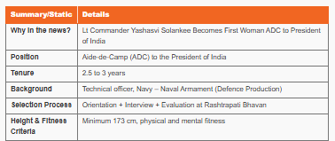 In a landmark development promoting gender inclusivity in the armed forces, 27-year-old Lieutenant Commander Yashasvi Solankee has been appointed as the first-ever woman Aide-de-Camp (ADC) to the President of India. Following a rigorous evaluation and orientation, Solankee took charge on May 9, 2025