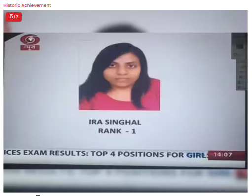 Ira Singhal, the 2014 UPSC topper, is a remarkable example of determination and courage. Born with scoliosis, a spine disorder that limits her arm movement, she cleared the UPSC Civil Services Examination not once but four times, finally securing the AIR 1 in her fourth attempt.