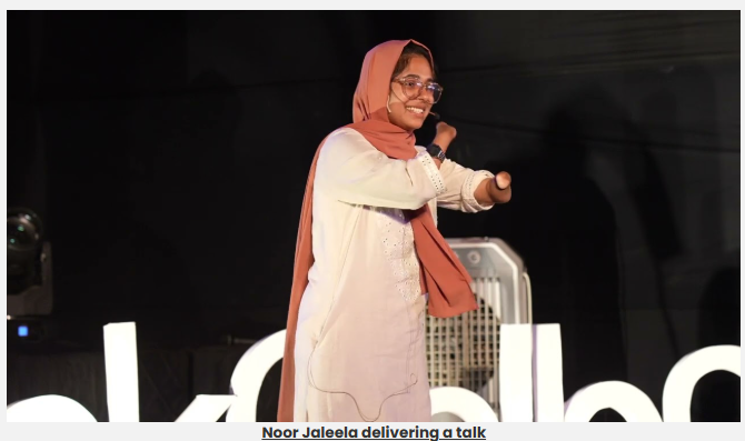 Noor Jaleela is another word for life. She was born without upper and lower limbs, but like life itself she did not let any disability come in her way; she set an example of living a fulfilled and joyful life for people of all genders, religions or whatever disadvantages they face.