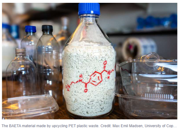 With the new chemical technology, researchers can transform PET plastic waste that is overlooked by recyclers into a primary resource in a new form of CO2 sorbent they have developed. The process “upcycles” it to a new material the researchers have named BAETA, which can absorb CO2 out of the atmosphere so efficiently that it easily compares with existing carbon capture technologies.