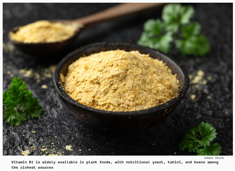 He explains that vitamin B1 is widely available in plant foods, highlighting options like nutritional yeast, tahini, and beans as top sources. “Virtually all of which are actually either plant-based or fungi,” he says, noting how common thiamine-rich foods are in plant-forward diets. While therapeutic doses in studies often involve supplements, he makes clear that everyday foods still contribute meaningfully.